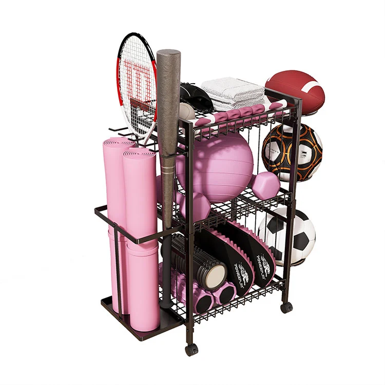 この床置き型金属製ヨガマット収納ラックには、3 層と 2 つのサイド収納システムがあります。左側は独立したデザインでスペースが広くなり、通常サイズのヨガマットを立てて2~3枚収納可能です。立てて収納できるので、テニスラケットや野球バット、ホッケースティックなどの長いタイプの用具も収納できます。